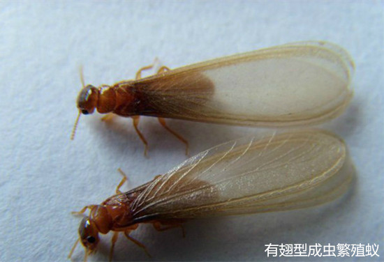 或有翅型:體軀骨化,黃、褐或黑色,有兩對發達的翅。每年4-6月是其分飛高峰期,特別是在春夏雨后悶熱時,大量長翅繁殖蟻從蟻巢中飛出,在離巢不遠處的建筑物附近低飛,飛行時間很短,這種現象稱為婚飛或群飛(分群)。群蟻在低空飛舞,好像在開舞會,各自毫無拘束地自由選擇對象。"情投意合者"飛落地面,各自脫掉翅膀,雌雄成雙追逐,通常為雌前雄后,完成"婚配"大事。配對后的雌雄成蟲經一段時間后,便開始尋找合適場所,建筑新巢"定居"。入穴后,雄蟲常用口器舔舐雌蟲的腹部,有時雌雄蟲彼此舔舐,然后產卵,繁殖后代,另立新的群體。這對"新婚"的雌雄蟻,就是未來新群體的母蟻和父蟻,也就是新群體中的蟻后和蟻王。大多情況下,這對伴侶終身過著"一夫一妻制"的文明社會生活。但不是婚飛中的所有個體都能成雙建立新群,當它們大量飛出時,常被各種鳥類、捕食性昆蟲或其他動物吃掉,往往只有其中的少數能夠幸存下來,但盡管是少數,也足以維持其種族繁衍,并造成對木質建筑物的危害的了,王后躺在王室中可是專門"生育"的,到一定時期又有成蟲出飛建立新的群體。